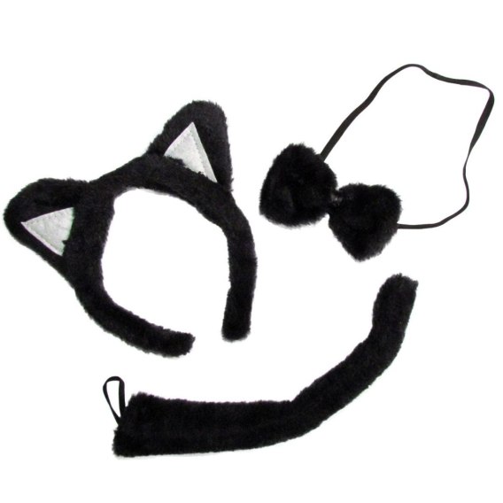 Komplet z motywem zwierzaków wykonany z miękkiego materiału W zestawie opaska z uszami, ogonek oraz muszka na gumce Wymiary: opaska 14x13 cm ogonek 25 cm muszka 10,5 cm Dostępne wzory: kot, królik, tygrys