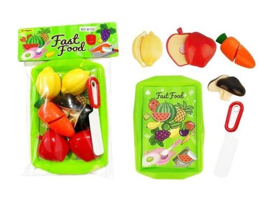 Zestaw owoców i warzyw do krojenia. W zestawie znalazły się m.in.: cytryna, jabłko, grzyby, marchewka nóż i deseczka. Produkt zapakowany w przezroczysty worek. Zabawka dla dzieci od 3 lat. Podane wymiary są wymiarami opakowania.