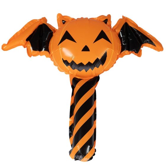 Balon foliowy z uchwytem z motywem halloweenowym - skrzydlata dynia. Może stanowić dekorację imprezy lub element kostiumu na Halloween.