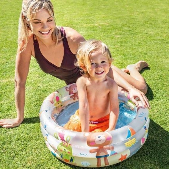 Dziecięcy, dmuchany basenik marki Intex doskonale sprawdzi się podczas upalnych dni. Potrójna obręcz zapewnia stabilność, ciekawy wzór i kolorystyka świetnie wpisują się w klimat wodnych zabaw. Ten basen dla dzieci można używać zarówno w ogrodzie jak i na wyjeździe wakacyjnym. Produkt został stworzony z myślą o najmłodszych dzieciach. Ze względu na wymiary i głębokość basenu jego pojemność nie przekracza 60 litrów, a sam wykonany jest z trwałego winylowego materiału. Do baseniku można nalać wody, pojemność 33L.
