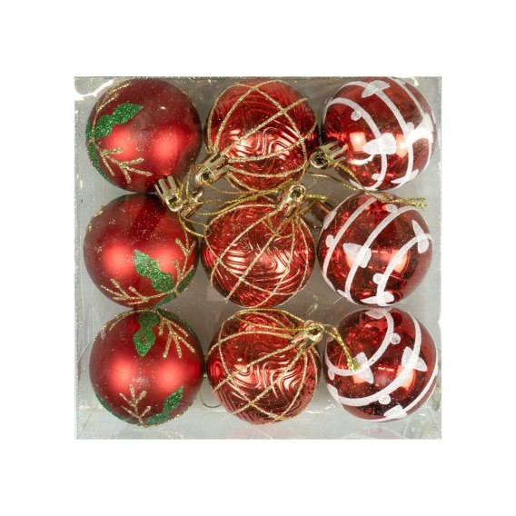Zestaw bombek ze zdobieniem to elegancka kompozycja klasycznych, okrągłych ozdób choinkowych o średnicy 5 cm. Każda bombka posiada delikatne detale i zdobienia, które pięknie odbijają światło lampek choinkowych, nadając aranżacji subtelnego uroku. Bombki doskonale sprawdzą się w tradycyjnych i nowoczesnych wnętrzach, łącząc prostotę formy z dekoracyjnym charakterem. Cechy produktu: Wielkość: 5 cm. Ilość: 9 szt. w zestawie. Motyw: zdobienia świąteczne. Kolorystyka: klasyczna, elegancka czerwień. Zastosowanie: Dekoracja choinki. Ozdoba do stroików i wieńców. Dodatek do świątecznych aranżacji stołu. Prezentowy komplet bombek dla miłośników tradycji. Zestaw czerwonych bombek ze zdobieniem to elegancki i uniwersalny wybór, który nada każdej choince blasku i klasycznego piękna.
