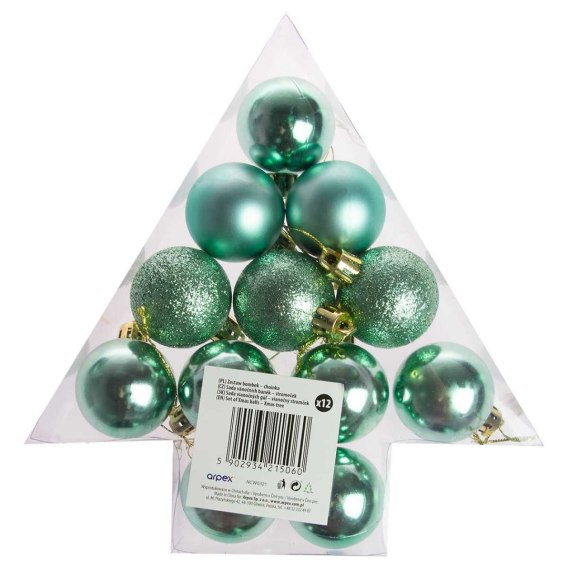Zestaw bombek w świątecznym opakowaniu w kształcie choinki. Opakowanie transparentne umożliwiające zapoznanie się z produktem bez wyjmowania z pudełka. Zestaw zawiera trzy rodzaje bombek w kolorze miętowym - gładkie, matowe oraz brokatowe. 12 sztuk w opakowaniu. Bombki o średnicy 4 cm.