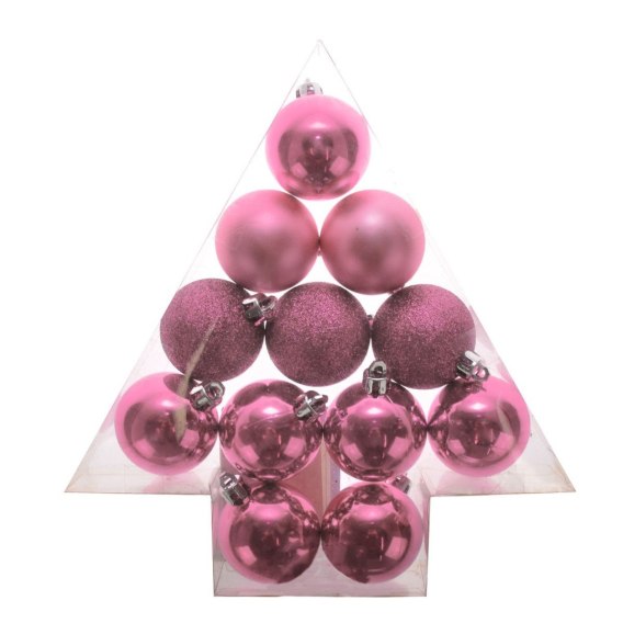 Zestaw bombek w świątecznym opakowaniu w kształcie choinki. Opakowanie transparentne umożliwiające zapoznanie się z produktem bez wyjmowania z pudełka. Zestaw zawiera trzy rodzaje bombek w kolorze różowym - gładkie, matowe oraz brokatowe. 12 sztuk w opakowaniu. Bombki o średnicy 4 cm.