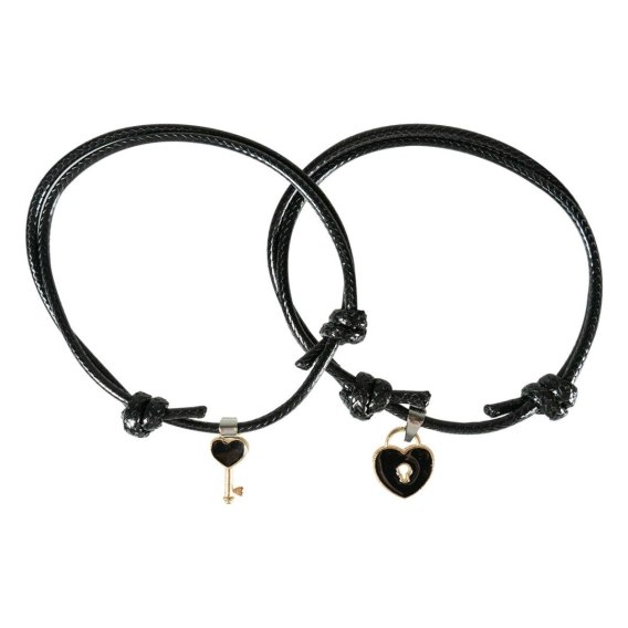 Komplet bransoletek dla par, przyjaciół. Wykonane z czarnego sznurka. Jedna bransoletka posiada zawieszkę w kształcie serca, druga w kształcie klucza. Rozmiar uniwersalny. 2 sztuki w zestawie.
