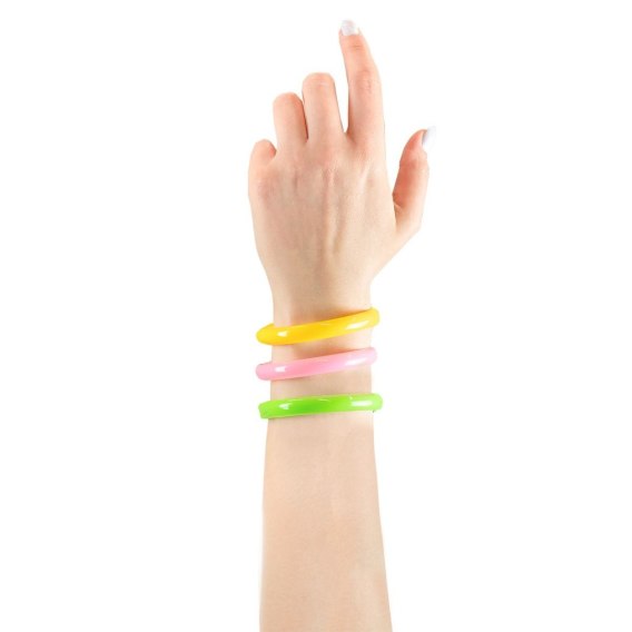 Komplet trzech bransoletek w kolorach neonowych. Produkt wykonany z tworzywa sztucznego. Doskonały dodatek do stylizacji nawiązujących do lat 80', na festiwale i koncerty. W zestawie znajdują się bransoletki w różnych kolorach. Rozmiar uniwersalny. Średnica bransoletki wynosi około 7 cm.