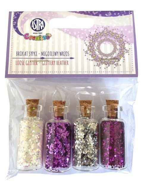 Zestaw 4 brokatów sypkich w pieknych odcieniach fioletu i bieli.