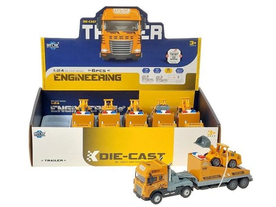 Auto ciężarowe z lawetą i koparką, metalowe, 30x10,5x7cm, światło, dźwięk, display 6szt; 48,5x11,3x33,3cm, Box