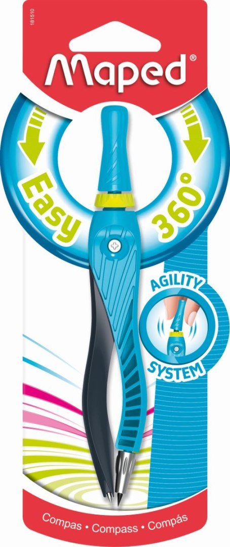 Plastikowy cyrkiel na grafity KIDZ 360°. Ruchoma główka zapewnia bardzo dużą zwrotność. Pozwala na wygodne manewrowanie oraz dokładną kontrolę siły nacisku. Ułatwia kreślenie idealnie okrągłych kształtów i rysunków geometrycznych dzieciom, które nie mają jeszcze w pełni rozwniętych zdolności manualnych. Dwie wersje kolorystyczne: niebiesko-czarny i różowo-czarny. J.S.: 1 blister