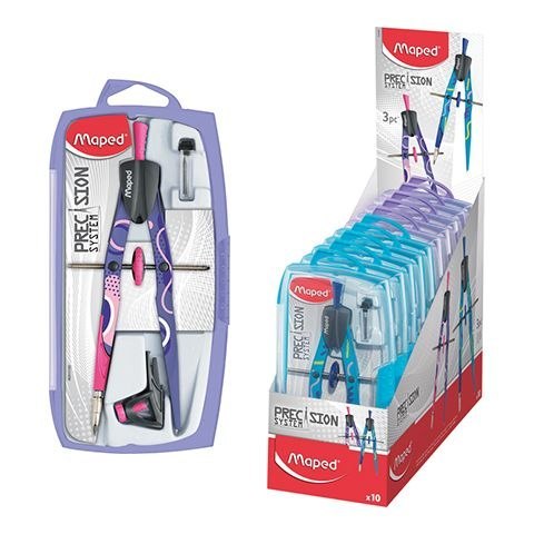 Cyrkiel zerowy z końcówką grafitową i uniwersalną oraz zapasowymi grafitami, maksymalny promień 300 mm, długość cyrkla 165 mm. Dwie wersje kolorystyczne: niebieska i fioletowo-różowa. Pudełko odporne na pęknięcia. J.S.: 1 szt.