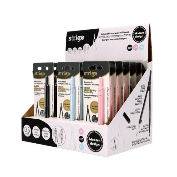 Zestaw 18 automatycznych cyrkli STRIGO w praktycznym i estetycznym displayu to świetna propozycja dla szkół, pracowni technicznych, artystów oraz punktów sprzedaży detalicznej.