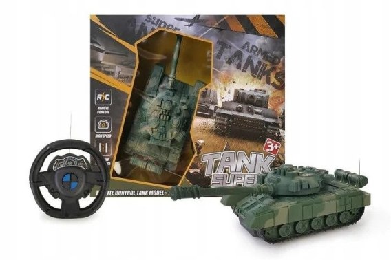 Funkcje: jazda do przodu, do tyłu + skręt, ruchoma wieżyczka, Pozostałe informacje: dł. czołgu 21 cm, wym. opak. 27 x 24,5 x 6 cm, baterie 3 x aa (czołg), 2 x aa (pilot) niedołączone, 3+