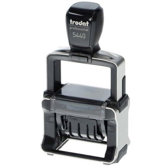 Datownik Trodat Professional 5440, z płytką tekstową, wysokość czcionki 4 mm, maksymalna średnica płytki 45 mm. Data w wersji ISO.