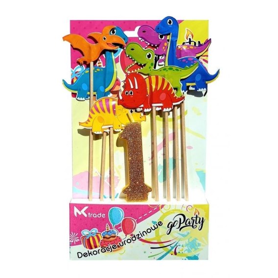 Dekoracja urodzinowa DF-034, Topper złota świeczka i kolorowe dinozaury na piku 8 szt.