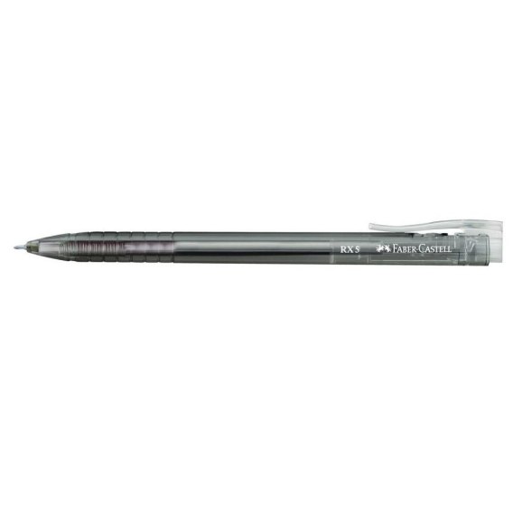 Długopis automatyczny RX 5 Faber-Castell w kolorze czarnym. Zapewnia doskonałe wrażenia podczas pisania i niestrudzone użycie dzięki super gładkiemu tuszowi, który miękko rozprowadza się po papierze. Z ergonomiczną strefą uchwytu z rowkami na powierzchni. Wyposażony w elastyczny klips. Wodoodporny tusz nie rozmazuje się na papierze. Cienka końcówka o grubości linii pisania: 0,5 mm.