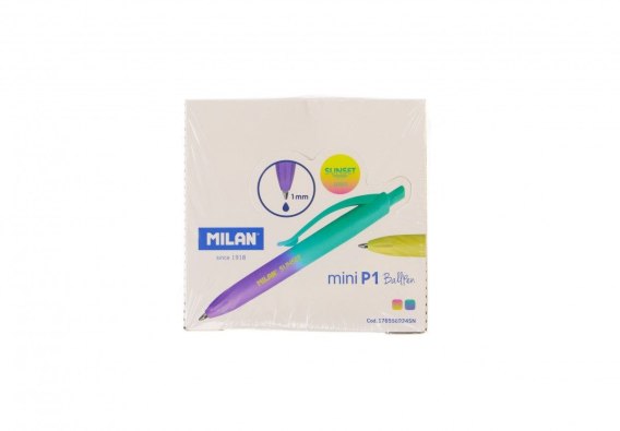 Długopisy niebieskie P1 MINI TOUCH SUNSET. Pstrykane. Przybliżona długość pisania: 600 metrów. Końcówka 1 mm. Atrament wyprodukowany w Niemczech. Oryginalny produkt stworzony przez własny dział badawczo-rozwojowy MILAN. Dostępny w 2 wersjach kolorystycznych obudowy: żółto-różowej i zielono-fioletowej. Rozmiar długopisu: 10,2 x 1,7 Ø 1 cm.