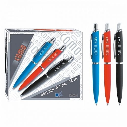 Zalety produktu: Długopisy Como z kolekcji Starpak dedykowanej dla szkoły i biura. Zestaw 24 długopisów o grubości pisania 0.7 to połączenie eleganckiego designu, wysokiej jakości wykonania oraz atrakcyjnej ceny. Długopisy Como stanowią perfekcyjne rozwiązanie dla każdego biura czy szkoły. Zapoznaj się również z innymi produktami Starpak Długopisy pakowane w displayu po 24 sztuki. Produkt nieodpowiedni dla dzieci poniżej 3 roku życia. Wymiary opakowania wys. szer. x gł. cm : 3,5x19x20,5 Cechy produktu:- modele szkolne i biurowe- grubość linii pisania 0,7 mm- mechanizm długopisów automatycznych gwarantuje wysoką trwałość- linia pisania jest ciągła i równa, bez przerw, zgrubień i zmiennej tonacji- zastosowany atrament jest trwały i nie blaknie pod wpływem światła. Opis: W ofercie STARPAKA znajduje się 55 różnych modeli długopisów. Od śmiesznych z motywami zabawnych zwierzaków, przez klasyczne długopisy szkolne, praktyczne biurowe po eleganckie długopisy idealne do damskiej torebki. Każdy znajdzie coś dla siebie. Wszystkie długopisy STARPAK charakteryzują się wysoką jakością tuszu i końcówki piszącej. Dzięki temu linii pisania jest ciągła i równa, bez przerw, zgrubień i zmiennej tonacji. Grubość linii pisania to 0,7 mm. Tusz STRAPAK jest tez bardzo trwały i nie blaknie pod wpływem światła. W długopisach automatycznych STARPAK zastosowaliśmy bardzo trwały i wytrzymały mechanizm wysuwania wkładu. Nasze długopisy piszą nie tylko w klasycznych kolorach: czarnym i niebieskim, ale oferujemy również długopisy wielokolorowe. Długopisy wielokolorowe STARPAK zastępują 6 długopisów w różnych kolorach. Dla uczniów STARPAK ma specjalny długopis z chowanym notesikiem. Bardzo pomocny przy wszelkiego rodzaju klasówkach i sprawdzianach. Długopisy STARPAK są dostępne w blistrach, woreczkach z zawieszką, pudełkach i displayach. Można je dzięki temu wyeksponować w różnych miejscach sklepu.
