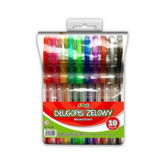 Komplet 10 sztuk długopisów żelowych brokatowych w etui z PCV. Końcówka kulkowa 1,0 mm.