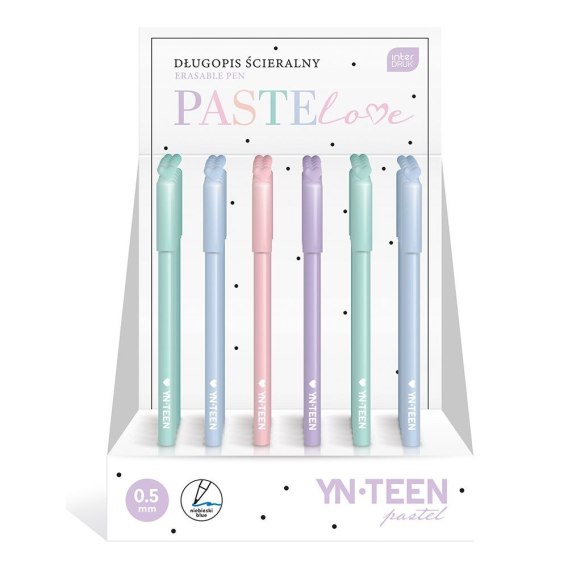 Grubość pisania: 0,5 mm. Niebieski wkład. Zamykany na ozdobną skuwkę w kształcie serca. Zakończony gumką, która umożliwia szybką i estetyczną korektę napisanego tekstu, bez użycia korektora czy przekreślania. Obudowa w 4 delikatnych, pastelowych kolorach. 36 szt. w displayu. Poznaj nasze pozostałe pastelowe akcesoria i produkty papiernicze i stwórz swój zestaw!