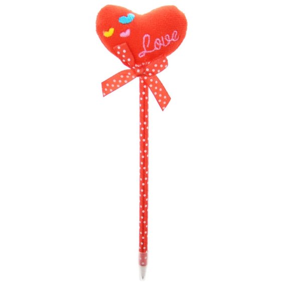 Długopis ozdobiony wstążeczką i miękkim serduszkiem z różnymi aplikacjami. Całość w kolorze czerwonym. Wymiar serduszka 6x5,5 cm. Długość całkowita ok. 22 cm.