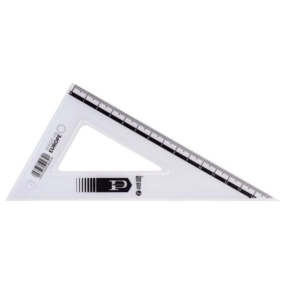 Standardowa przezroczysta ekierka. Charakteryzuje się nieścieralnymi podziałkami i precyzyjnym nadrukiem skali (do 1/1000 cm). Produkt ma zaokrąglone rogi dla bezpieczeństwa użytkownika. Wykonana z plastiku o odpowiednim stosunku twardości do elastyczności zapewniającym wysoką odporność na złamania. Wyprodukowana zgodnie z europejskiminormami.