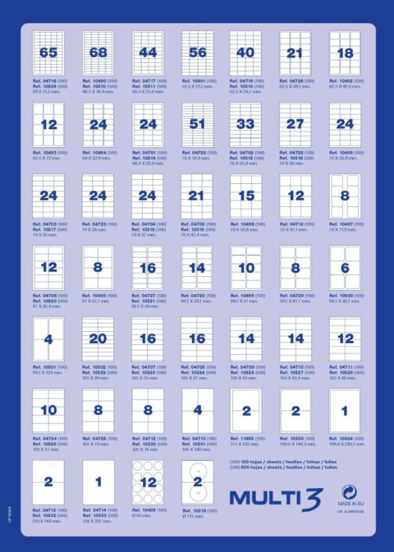 Etykiety adresowe białe, samoprzylepne do drukarek atramentowych, laserowych i kerokopiarek. Arkusz formatu A4 oraz odpowiednie ułożenie etykiet na arkuszu zapewniają precyzję wydruku nawet przy automatycznym podajniku drukarki. Zapewniają najwyższą jakość wydruku i łatwość w użyciu. Pakowane po 100 arkuszy.