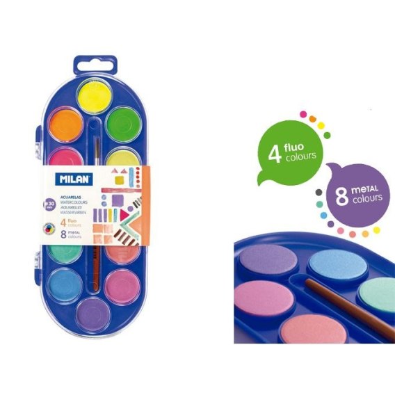 Farby akwarelowe z 4 kolorami fluorescencyjnymi i 8 metalizowanymi. Średnica pastylki 30 mm. Zawierają pędzel z naturalnego włosia dedykowany do farb akwarelowych. Pokrywka stanowi jednoczesnie paletkę do mieszania farb. Żywe, intensywne kolory uzyskuje się z nieszkodliwych, odpornych na światło pigmentów. Łatwo się spierają niemal z każdej powierzchni. Farby MILAN są zgodne z europejskimi i amerykańskimi normami bezpieczeństwa. Nie zawierają ftalanów, metali ciężkich i innych substancji toksycznych. Są bezpieczne dla dzieci. Rozmiar: 22,5 x 10 x 1,5 cm.