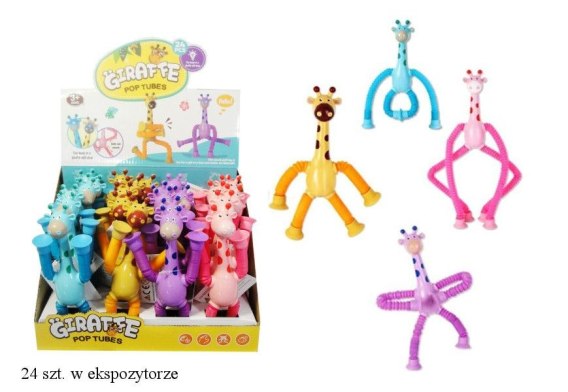 Kolorowe żyrafy, których kończyny można rozciągać, natomiast głowa po potrząsaniu świeci kolorowymi światełkami. Produkt występuje w kilku wersjach kolorystycznych, wybierany losowo. Cena dotyczy jednej sztuki. Podane wymiary są wymiarami nierozciągniętej zabawki.