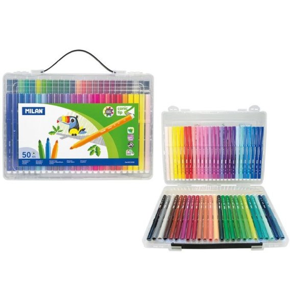 50-kolorowy zestaw flamastrów w twardej, plastikowej walizce. Flamastry posiadają stożkową końcówkę o średnicy 5 mm, która nie wpada do środka nawet przy silnym nacisku. Po chwilowym odkształceniu końcówka zawsze wraca do pierwotnego kształtu. Pozwala na rysowanie cienkich i grubych linii od 0,75 mm do 3 mm. Tusz na bazie wody tworzy jaskrawe i intensywne kolory, które można ze sobą mieszać. Tusz można łatwo wyprać z większości tkanin (moczyć tkaninę w zimnej wodzie przez godzinę, a następnie prać w pralce w niskiej temperaturze). Bezpieczna wentylowana skuwka umożliwia oddychanie w przypadku połknięcia. Flamastry MILAN są zgodne z europejskimi i amerykańskimi normami bezpieczeństwa. Nie zawierają ftalanów, metali ciężkich i innych substancji toksycznych. Są bezpieczne dla dzieci. Rozmiar flamastra: 16,5 x ø 1,04 cm. Rozmiar opakowania: 31 x 22,5 x 3 cm.