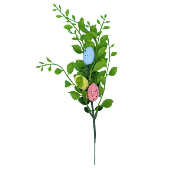 Gałązka bukszpanu z pisankami to bardzo uniwersalna ozdoba wielkanocna o szerokim zastosowaniu. Zielona gałązka zdobiona jest kolorowymi, nakrapianymi jajkami, które dodają świątecznego charakteru każdej kompozycji. Wielkość gałązki pozwala na łatwe dopasowanie jej do stroików lub wazonów. Produkt jest lekki i łatwy w przechowywaniu.