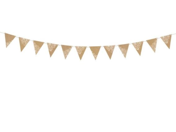 Girlanda flagietki, wykonana z kraftowego papieru z białym nadrukiem, do samodzielnego złożenia, zestaw zawiera 12 flagietek i ok. 3 m jutowego sznurka, wymiary po złożeniu: wysokość ok. 18 cm, długość ok. 2,1 m.