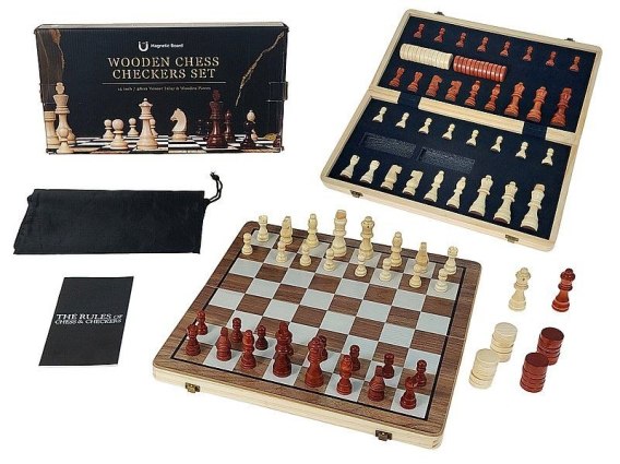 Szachy drewniane 39x39x2,3cm, pole: 42mm, król: 7,5cm, pionek: 3,5cm, warcaby: 3cm, 39x20,5x6cm BOX