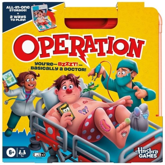 Jesteś—BZZZT!—prawie jak prawdziwy lekarz! Ulubiona gra planszowa dla dzieci powraca w nowej, ekscytującej wersji! W tej edycji gry Operacja możesz wybrać jeden z dwóch trybów rozgrywki: ���� Tryb Szpitala - klasyczna wersja, w której mali lekarze losują karty Bandaża i muszą leczyć zwariowane dolegliwości Cavity Sama. Trzeba mieć pewną rękę, bo jeśli narzędzia dotkną krawędzi—BZZZT!—jego czerwony nos zaświeci się! ���� Tryb Nagłego Wypadku - pełna napięcia, szybka rozgrywka, w której gracze muszą usunąć jak najwięcej chorób przed upływem czasu. Ale uwaga! Jeśli pęseta dotknie krawędzi, Cavity Sam zacznie bekać, krzyczeć i wydawać przezabawne dźwięki, które rozbawią wszystkich! W obu trybach zwycięża gracz, który usunie najwięcej dolegliwości i „wyleczy" pacjenta! Gra jest zapakowana w poręczne etui z miejscem do przechowywania, co czyni ją świetną propozycją na podróże i zabawę w dowolnym miejscu. Zawartość zestawu: ✅ Plansza do gry z przymocowaną pęsetą ✅ 12 dolegliwości (w tym gumka recepturka) ✅ 12 kart ✅ Instrukcja Dodatkowe informacje: ���� Wiek: 6+ ���� Liczba graczy: 1 lub więcej ���� Wymaga 3 baterii AA 1,5V (brak w zestawie) ����️ Wymagany montaż przez osobę dorosłą