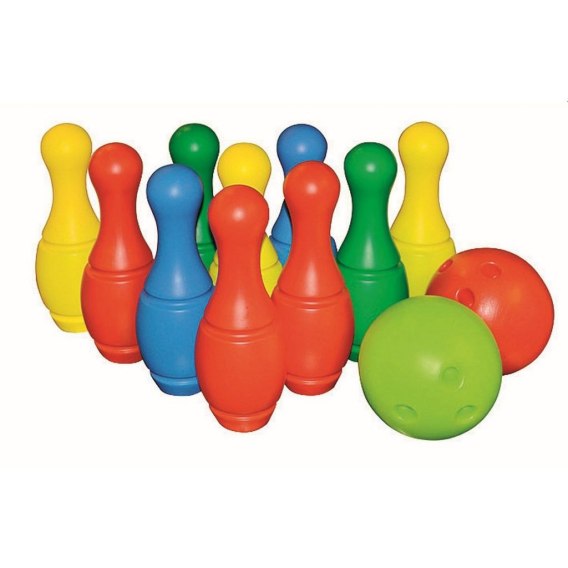 - Zestaw składa się z 10 dużych różnokolorowych kręgli oraz dwóch dużych kul, całość została zapakowana w plastikową siatkę.