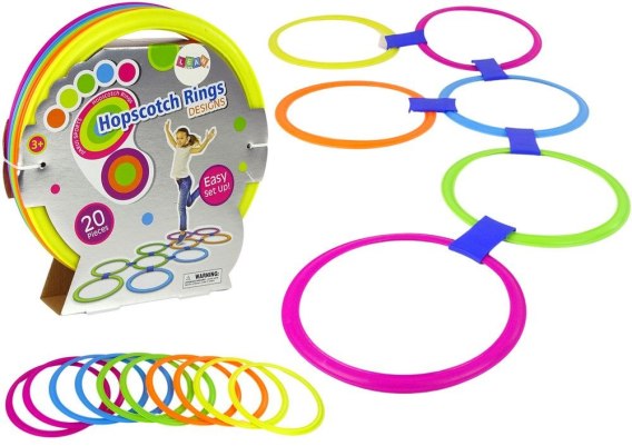 Kolorowe Obręcze Do Skakania Wiele Możliwości Zabawy ! Hopscotch Rings Gra w klasy jest zabawą znana od wielu lat. Grali w nie tylko nasi rodzice, a również dziadkowie. Ma nieskomplikowane zasady i można w nią grać niemalże wszędzie. Ilość grających osób jest nieograniczona - tak samo jak wiek - zabawa idealna już dla dzieci od 3 roku życia ! Zestaw zawiera 10 plastikowych obręczy i 10 złączek do swobodnego łączenia Wystarczy użyć wyobraźni i połączyć pierścienie w siatkę o dowolnym wzorze do skakania. Gra idealnie sprawdzi się do zabawy na dworze oraz w pomieszczeniu- możesz grać w klasy przez cały rok! Gra rozwija koordynację ruchową i umiejętności motoryczne u najmłodszych dzieci, a przede wszystkim zachęca do zabawy w grupie i aktywności fizycznej. Średnica jednej obręczy : 26 cm Gra zawiera: 10 x Kolorowe Kręgi 10 x Złącza do dowolnej konfiguracji obręczy Wymiary opakowania: 28 cm x 31 cm x 6 cm Gra zapakowana w kartonik. Posiada certyfikat CE, Wykonana z odpornego, nietoksycznego materiału. Zabawka zgodna z certyfikatem EN71. idealny pomysł na prezent !
