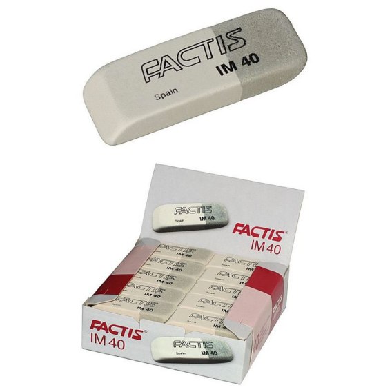 Średnia, dwustronna guma do ołówków i tuszów z kauczuku naturalnego, uniwersalna, wymiary: 52x19,5x7.8 mm, produkcja : Factis, Hiszpania