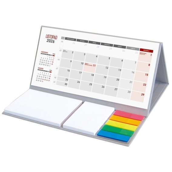 Wygodny kalendarz stojący na biurko z przejrzystym kalendarium w układzie miesięcznym z poręcznymi karteczkami samoprzylepnymi do notowania. Przydatny zwłaszcza w biurze. W kalendarzu zaznaczono święta.