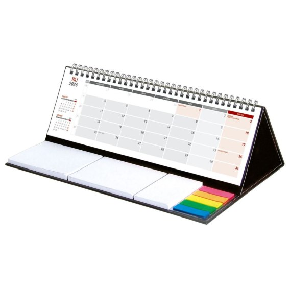 Wygodny kalendarz stojący na biurko z przejrzystym kalendarium w układzie miesięcznym z poręcznymi karteczkami samoprzylepnymi do notowania. Przydatny zwłaszcza w biurze. W kalendarzu zaznaczono święta. Kalendarium spiralowane.