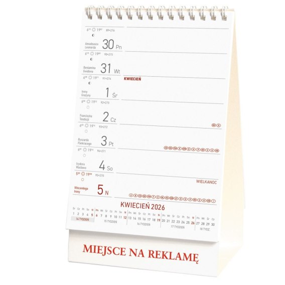Wygodny kalendarz stojący na biurko z przejrzystym kalendarium w układzie tygodniowym, z dużym obszarem do notowania. W dolnej części kalendarium przegląd aktualnego miesiąca. W dolnej części kartonowej podstawki istnieje możliwość wykonania nadruku reklamowego na obszarze o wymiarach 120 x 20 mm. Istnieje możliwość założenia indywidualnej okładki. W kalendarzu zaznaczone święta i daty imienin.
