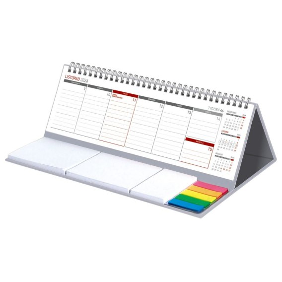 Wygodny kalendarz stojący na biurko z przejrzystym kalendarium w układzie tygodniowym z miejscem do notowania. Poręczne samoprzylepne karteczki. Kalendarium na spirali.