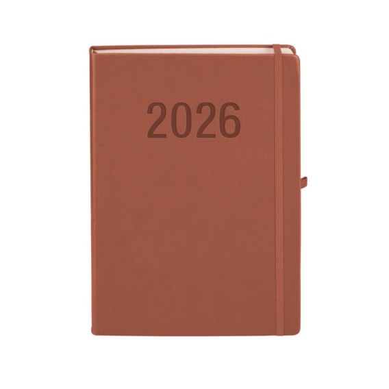 Format A4, oprawa: twarda, materiał: Vivella, papier: 70g, kolor papieru: ecru, pionowa gumka zamykająca,gumka na długopis, zaokrąglone rogi, wyklejka z ozdobnego papieru ecru, koperta na luźne karteczki, wstążka w kolorze okładki, dodatkowe strony: skrócony kalendarz 2025-2027, plan roku 2026, notatnik oraz skorowidz adresowy, 350 stron, osobno sobota niedziela