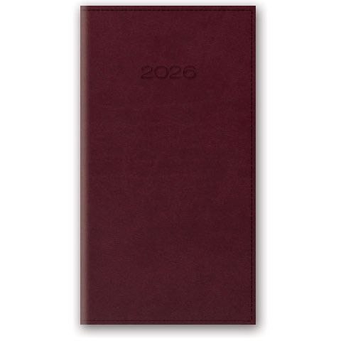 Kalendarz w układzie tygodniowym (tydzień na rozkładówce). Format kieszonkowy A6 (blok: 8,5 x 15,3 cm), papier kremowy, druk szaro-bordowy, registry drukowane. Wstążka-zakładka; 128 stron; notes teleadresowy. Dwa rodzaje okleiny skóropodobnej: gładka lub z tłoczonymi reliefowymi deseniami oraz okleina graficzna (drukowana). Typ okładki: standard bez gąbki.