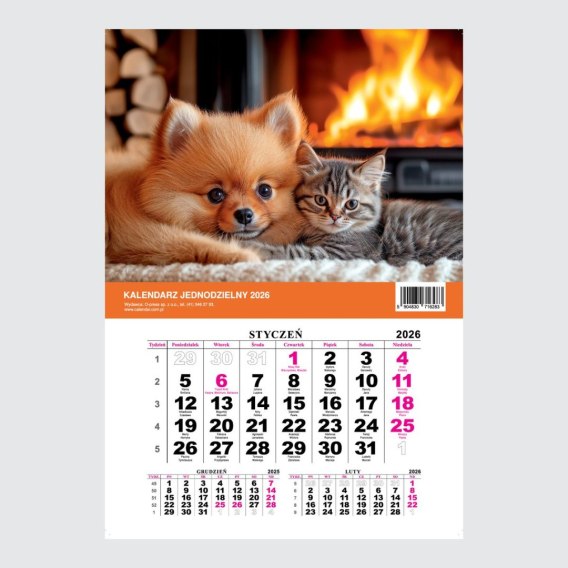 - Format 137 x 210 mm - Ilość stron: 13 - Oprawa: klejona - Możliwość przymocowania na lodówkę za pomocą magnesów umieszkonych na tylnej ściance - Układ kalendarium: 1 miesiąc na stronie - Duży i czytelny numer dnia roku i tygodnia - Miejsce na notatki - Zawiera czytelne kalendarium z imieninami i Świętami w języku polskim Miesięczny kalendarz "Milusińscy" z magnesem na lodówkę w formacie A5 (137 x 210 mm) to idealny dodatek dla wszystkich miłośników zwierząt. Każda strona kalendarza ozdobiona jest uroczymi ilustracjami psiaków i kotów, które wprowadzają ciepły, przyjazny klimat do codziennego planowania. Dzięki przejrzystemu układowi z miejscem na ważne zapisy i przypomnienia, kalendarz ułatwia efektywne zarządzanie miesiącem. Dodatkowa przestrzeń na notatki znajdująca się na końcu kalendarza pozwala na zapisywanie list zakupów, planów czy innych przydatnych informacji. Dzięki magnesowi kalendarz można wygodnie przymocować do lodówki, co sprawia, że zawsze znajduje się w zasięgu wzroku - gotowy do użycia w każdej chwili. To praktyczny, estetyczny i inspirujący element wyposażenia kuchni, który łączy funkcjonalność z miłością do zwierząt