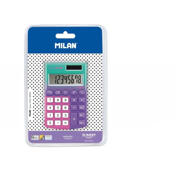 Kalkulator 8-pozycyjny z miękkimi gumowymi klawiszami. Tęczowa kolorystyka nawiązuje do kolekcji SUNSET. 3 klawisze pamięci. Klawisz zmiany znaku +/-. Pierwiastek kwadratowy. Podwójne zasilanie: bateria 1,5V oraz bateria słoneczna. Automatyczne wyłączanie. Kalkulatory MILAN spełniają wymagania dyrektywy RoHS o ograniczeniach stosowania niektórych substancji niebezpiecznych w urządzenia elektrycznych i elektronicznych. Pakowany na blistrze. Rozmiar kalkulatora: 9,7 x 6,2 x 0,8 cm.