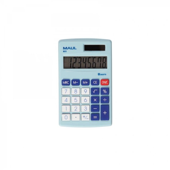 Kieszonkowy kalkulator MAUL M 8 w kolorze niebieskim z dużym, 8-pozycyjnym wyświetlaczem LCD. Niezawodny, stylowy i dokładny. Wyjątkowo płaski: mieści się w każdej torbie, teczce, tornistrze czy plecaku. Sprawia, że życie staje się kolorowe! Dostępny w 3 modnych wersjach kolorystycznych. Szybsze wyszukiwanie: przyciski funkcyjne i numeryczne w różnych kolorach. Kompaktowy rozmiar i zaokrąglone krawędzie sprawiają, że dobrze leży w dłoni. Z antypoślizgowymi, gumowymi przyciskami. Energooszczędny, dzięki podwójnemu zasilaniu baterią i baterią słoneczna, z funkcją automatycznego wyłączania. Wyposażony w 3 przyciski pamięci, obliczanie pierwiastków kwadratowych i procentów. Gwarancja: 5 lat. Wymiary: 11,5 x 6,9 x 1,0 cm. Zawiera jedną baterię (LR1130). Ekologiczne opakowanie z tektury, bez użycia plastiku, z eurozawieszką.