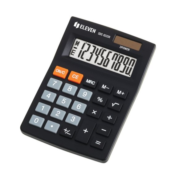 - 10-pozycyjny wyświetlacz, 3 przyciski pamięci: MRC, M+, M-, Pierwiastek kwadratowy [√], Procenty [%], Zmiana znaku [+/-],