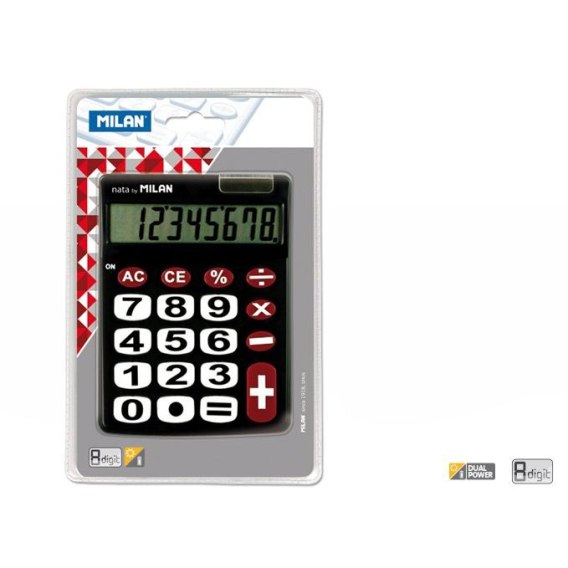 Kalkulator 8-pozycyjny z dużymi klawiszami i wyświetlaczem. Czarny kolor obudowy z białymi i czerwonymi detalami. Podwójne zasilanie: bateria 1,5V oraz bateria słoneczna. Automatyczne wyłączanie. Kalkulatory MILAN spełniają wymagania dyrektywy RoHS o ograniczeniach stosowania niektórych substancji niebezpiecznych w urządzenia elektrycznych i elektronicznych. Pakowany na blistrze. Rozmiar kalkulatora: 14,5 x 10,6 x 2,1 cm.
