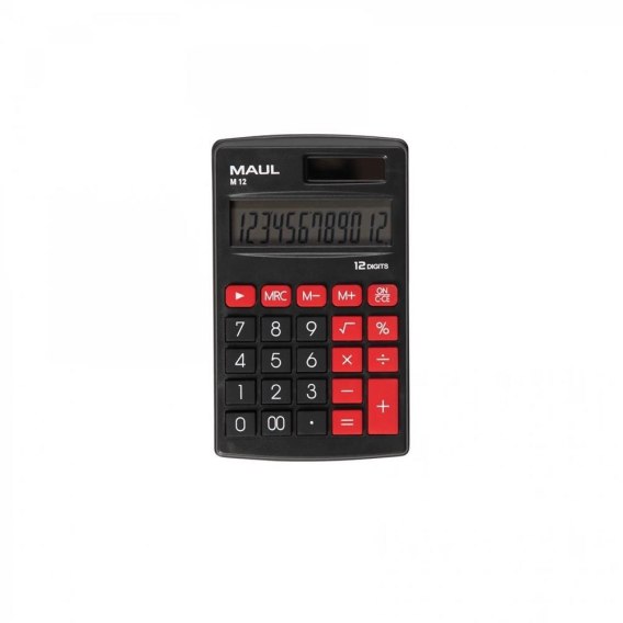 Kieszonkowy kalkulator MAUL M 12 w kolorze czarnym z dużym, 12-pozycyjnym wyświetlaczem LCD. Niezawodny, stylowy i dokładny. Wyjątkowo płaski: mieści się w każdej torbie, teczce, tornistrze czy plecaku. Sprawia, że życie staje się kolorowe! Dostępny w 3 modnych wersjach kolorystycznych. Szybsze wyszukiwanie: przyciski funkcyjne i numeryczne w różnych kolorach. Kompaktowy rozmiar i zaokrąglone krawędzie sprawiają, że dobrze leży w dłoni. Z antypoślizgowymi, gumowymi przyciskami. Energooszczędny, dzięki podwójnemu zasilaniu baterią i baterią słoneczna, z funkcją automatycznego wyłączania. Wyposażony w 3 przyciski pamięci, obliczanie pierwiastków kwadratowych i procentów. Gwarancja: 5 lat. Wymiary: 11,5 x 6,9 x 1,0 cm. Zawiera jedną baterię (LR1130). Ekologiczne opakowanie z tektury, bez użycia plastiku, z eurozawieszką.
