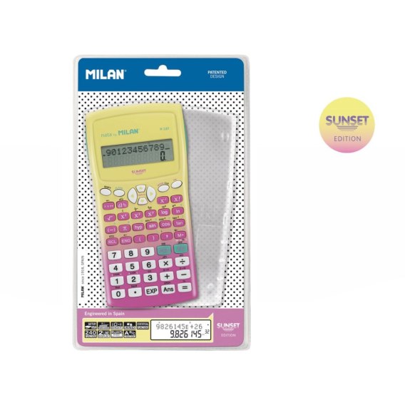Kalkulator naukowy z kolekcji SUNSET z 2 liniowym wyświetlaczem LCD (10 + 2 cyfry). Równoczesne wyświetlanie wyrażenia matematycznego i wyniku. Posiada 240 zintegrowanych funkcji. Żółto-różowy kalkulator z wytrzymałym przezroczystym pokryciem ochronnym. Zasilanie: 2 x baterie AAA w zestawie. Zawiera instrukcje. Kalkulatory MILAN spełniają wymagania dyrektywy RoHS o ograniczeniach stosowania niektórych substancji niebezpiecznych w urządzenia elektrycznych i elektronicznych. Oryginalny projekt stworzony przez własny dział badawczo-rozwojowy MILAN. Pakowany na blistrze. Rozmiar kalkulatora: 16,7 x 8,4 x 1,9 cm. Najważniejsze dostępne funkcje: obliczenia statystyczne; rachunek 6 różnych radzajów regresji wraz z ich współczynnikami A,B; wzajemna transformacja współrzędnych prostokątnych i biegunowych; bezpośrednie operacje na ułamkach, także sześćdziesiątkowych; funkcje trygonometryczne i odwrotne do trygonometrycznych; funkcje paraboliczne i hiperboliczne oraz im odwrotne; obliczenia z zastosowaniem jednostek kątowych w stopniach, radianach, gradach; konwersja między systemem dziesiętnym i sześćdziesiętnym; generowanie wartości losowych; obliczanie kombinacji i permutacji; notacja inżynierska; kursor do zmiany MENU; statystyka dwuwymiarowa z obliczaniem wartości średniej, szacowanej i sum; funkcje SCI/FIX/ENG.