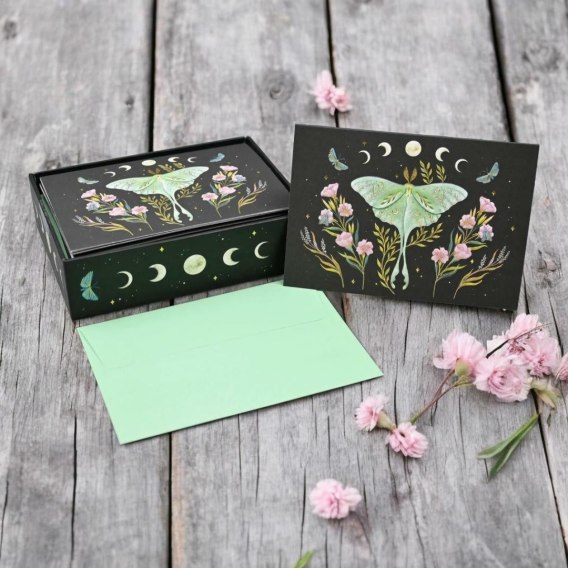 Elegancka kolekcja zdobionych karnetów na każdą okazję marki Peter Pauper Press - Księżycowa Ćma (Luna Moth). Uniwersalna otwierana kartka okolicznościowa z pustym środkiem pozwala na pełną personalizację i stworzenie wyjątkowej pamiątki dla obdarowanej osoby. Wzór na każdej kartce ma wytłaczane, ozdobione złotą folią elementy i został wydrukowany na papierze ze strukturą lnu. W skład zestawu wchodzą dopasowane kolorystycznie koperty. Całość została zapakowana w pudełko ozdobione tym samym wzorem. W skład zestawu wchodzi: - 14 karnetów wielkości 8,9 x 12,7 cm wykonanych z kredowanego papieru 180 gsm - 15 kopert wielkości 13 x 9,5 cm - gustowne pudełko.