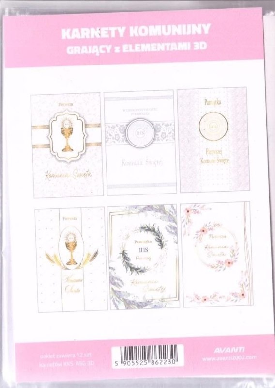 Karnety A5 z elementami 3D grające melodię "Pan Jezus już się zbliża". Opakowanie zbiorcze 12sztuk zawiera mix wzorów.